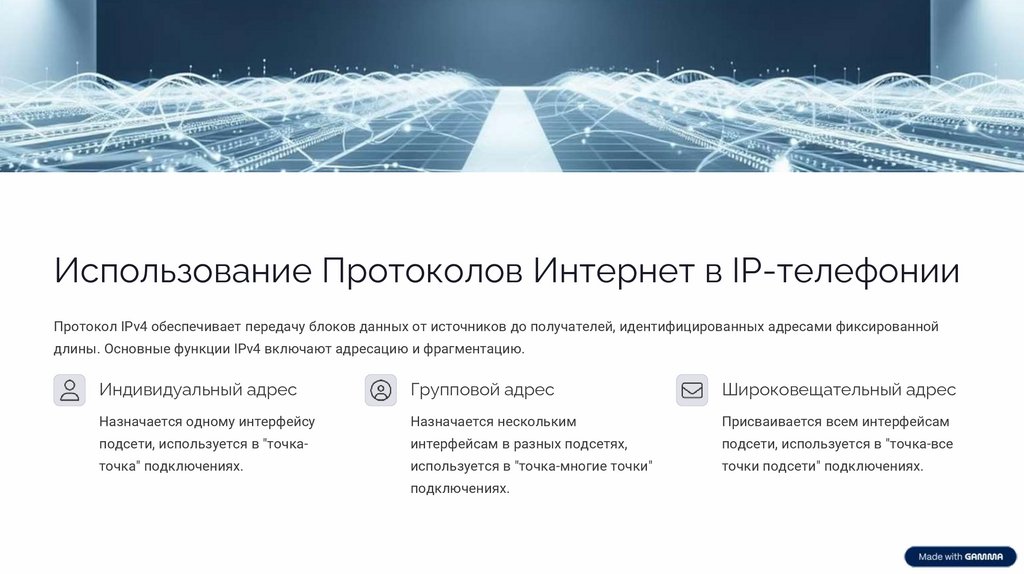 Использование Протоколов Интернет в IP-телефонииПротокол IPv4 обеспечивает передачу блоков данных от источников до получателей, идентифицированных адресами фиксированной