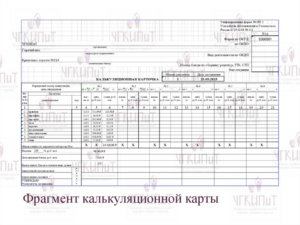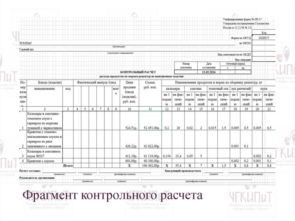 Фрагмент контрольного расчета15. Производственная программа ресторана на 175 посадочных мест