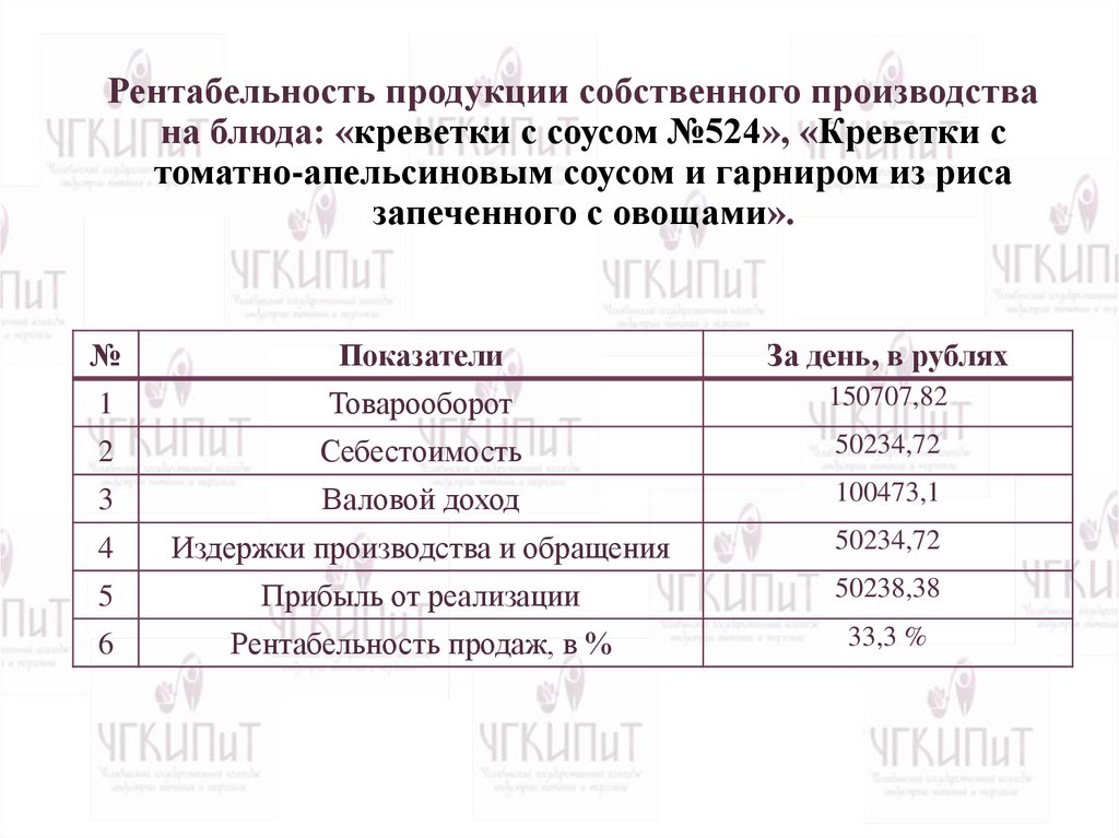 Рентабельность продукции собственного производствана блюда: «креветки с соусом №524», «Креветки с