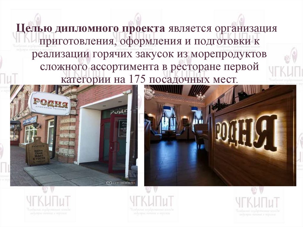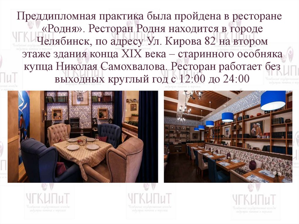 Преддипломная практика была пройдена в ресторане«Родня». Ресторан Родня находится в городе