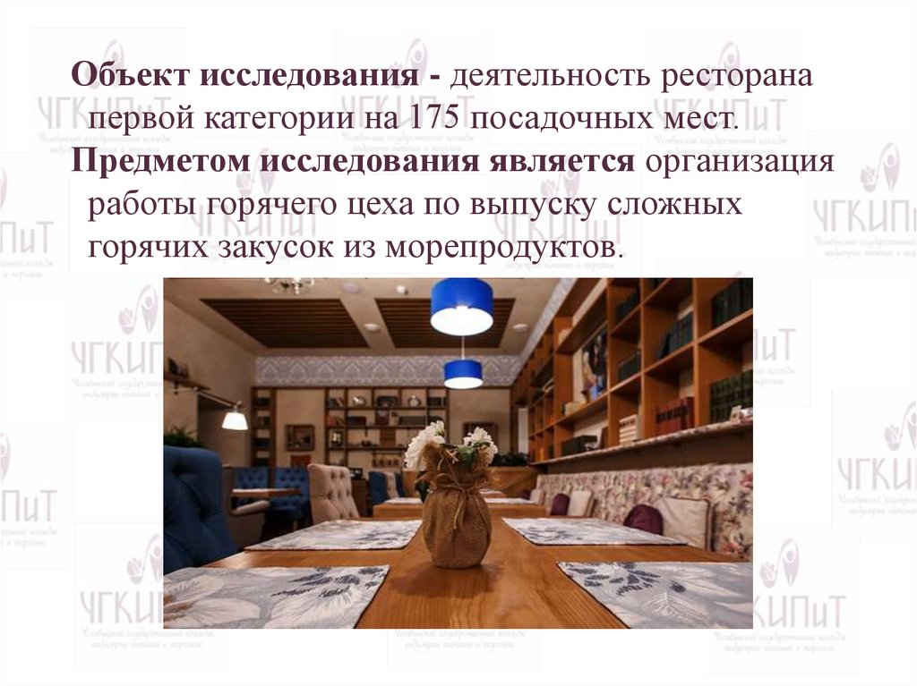 Объект исследования - деятельность ресторанапервой категории на 175 посадочных мест.