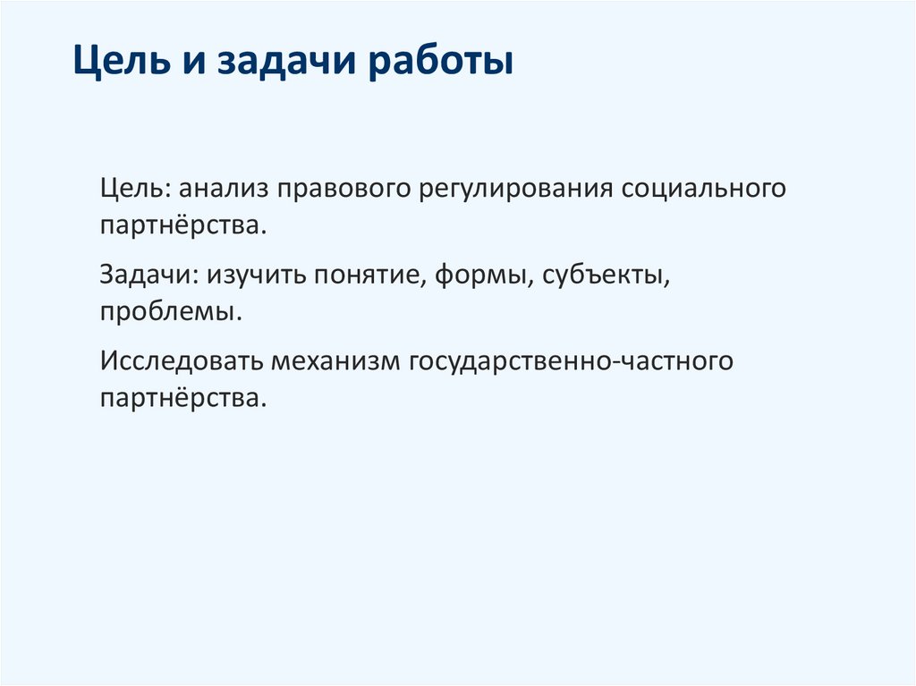 Цель и задачи работыЦель: анализ правового регулирования социального
