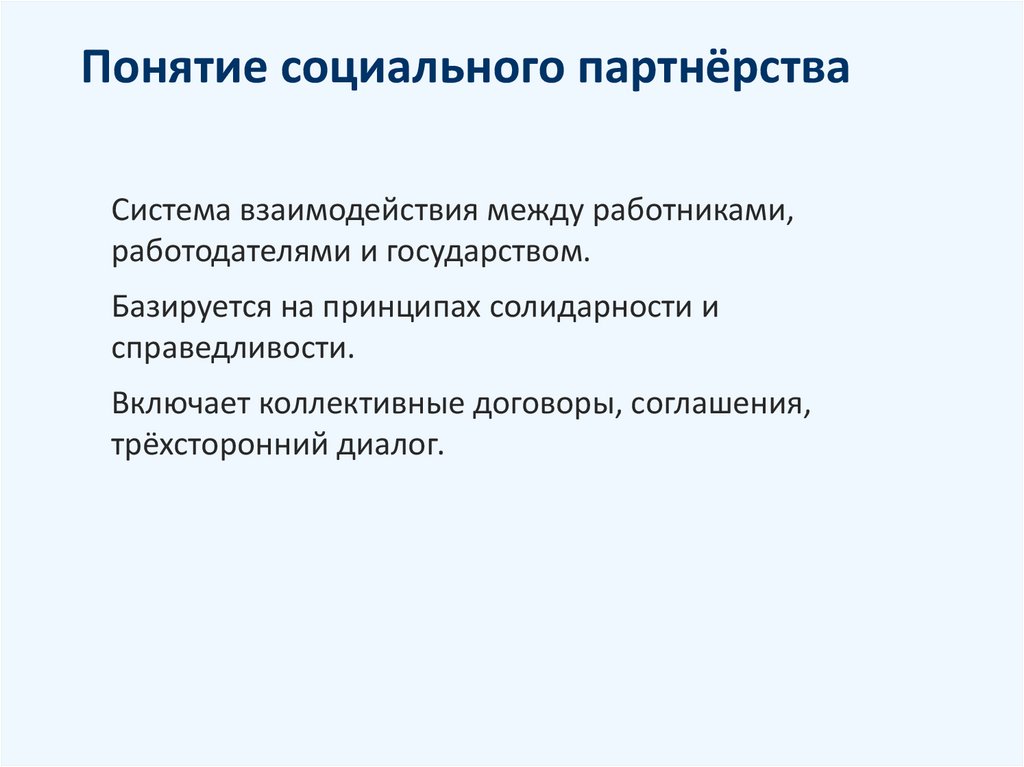 Понятие социального партнёрстваСистема взаимодействия между работниками,