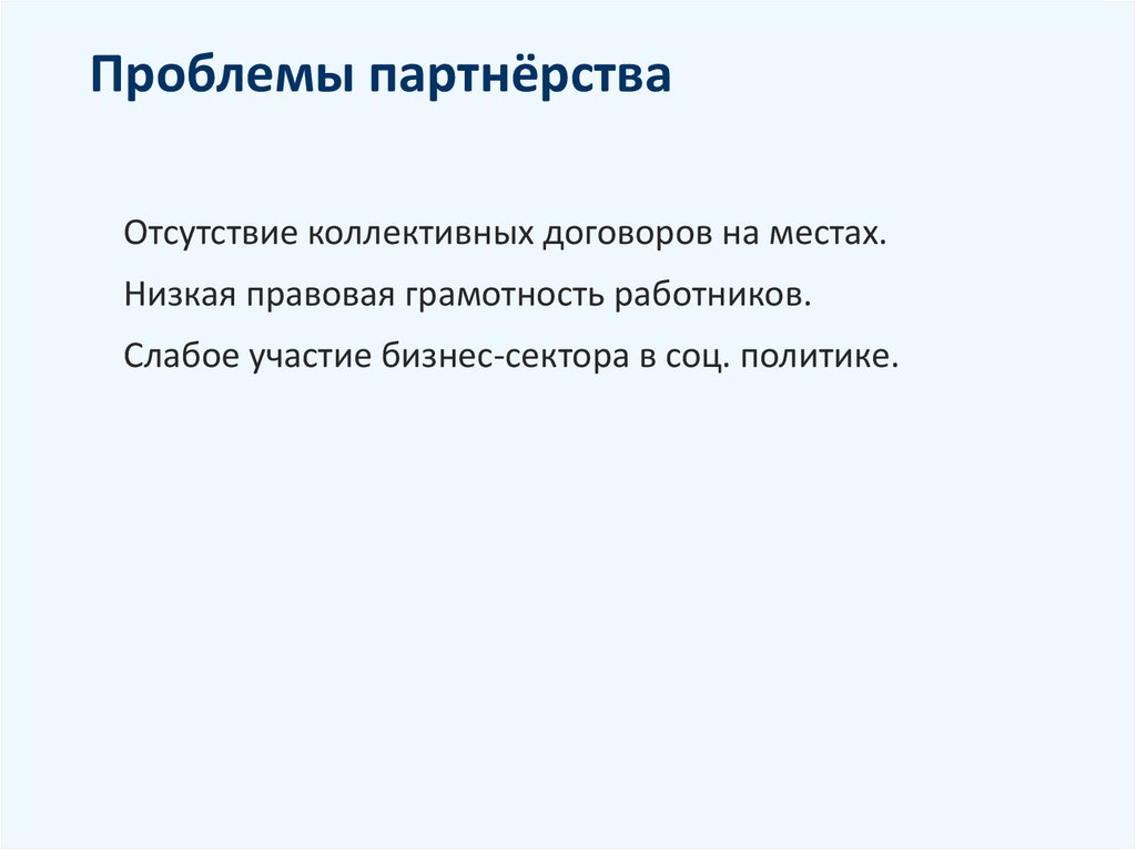 Проблемы партнёрстваОтсутствие коллективных договоров на местах.