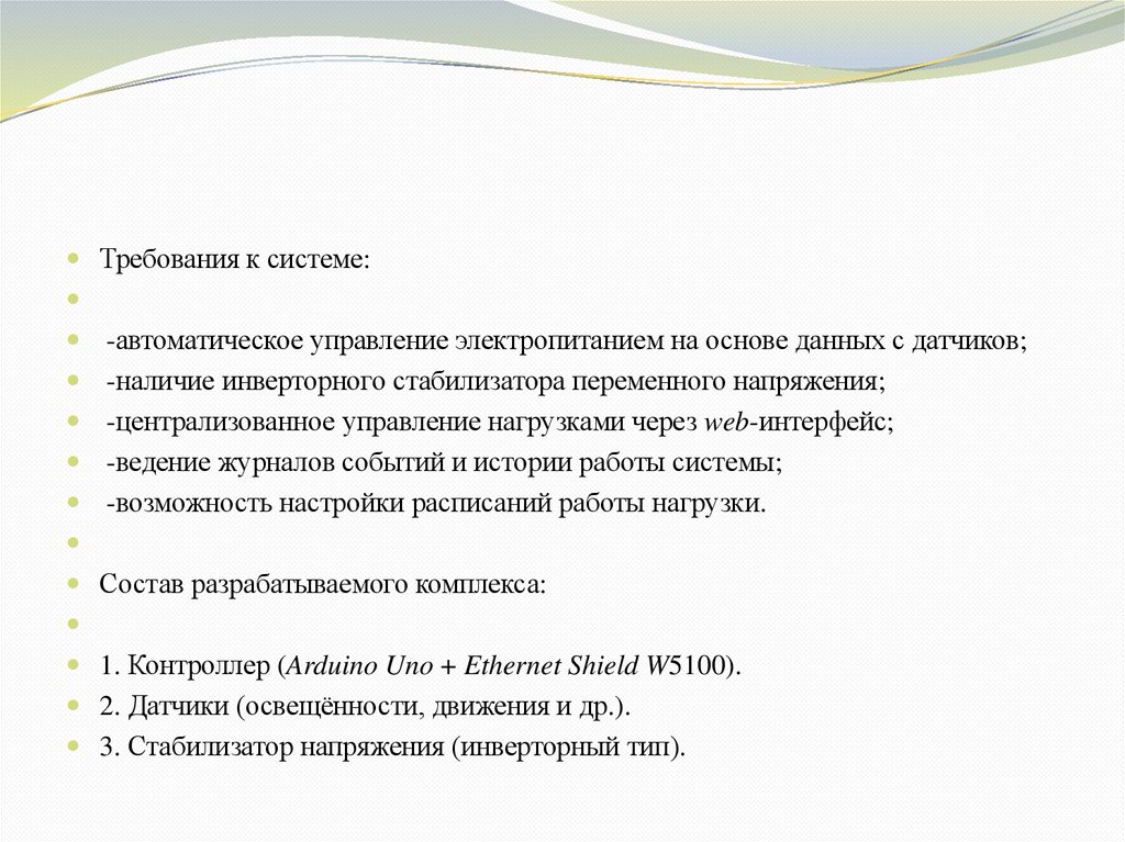 Требования к системе:-автоматическое управление электропитанием на основе данных с датчиков;