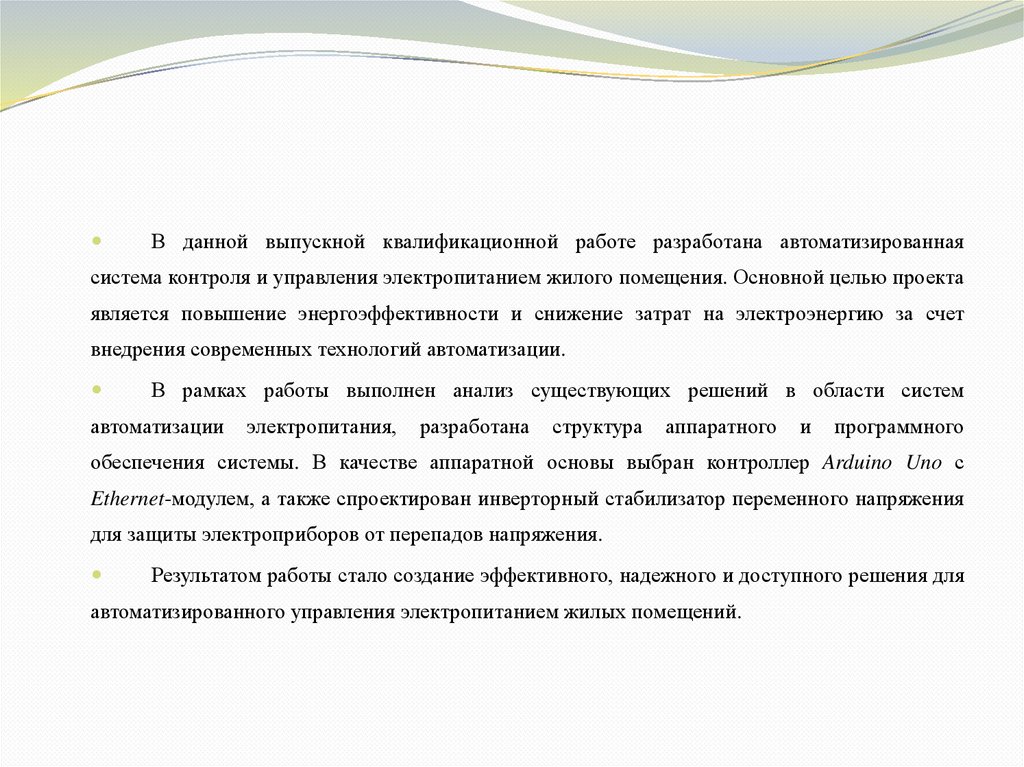 В данной выпускной квалификационной работе разработана автоматизированнаясистема контроля и управления электропитанием жилого помещения. Основной целью проекта