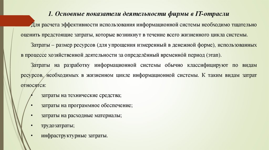 1. Основные показатели деятельности фирмы в IT-отраслиДля расчета эффективности использования информационной системы необходимо тщательно
