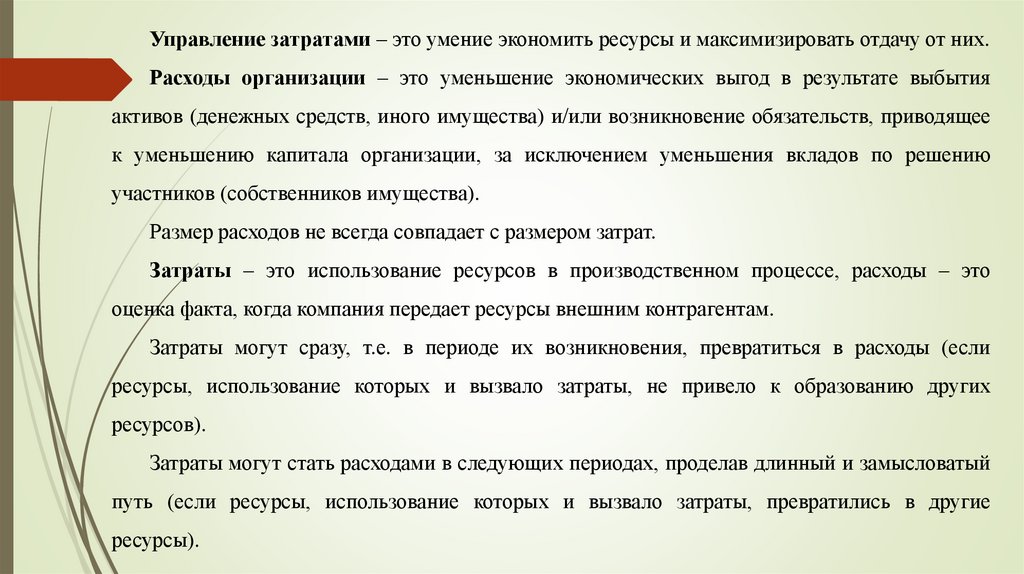 Управление затратами – это умение экономить ресурсы и максимизировать отдачу от них.Расходы организации – это уменьшение экономических выгод в результате выбытия