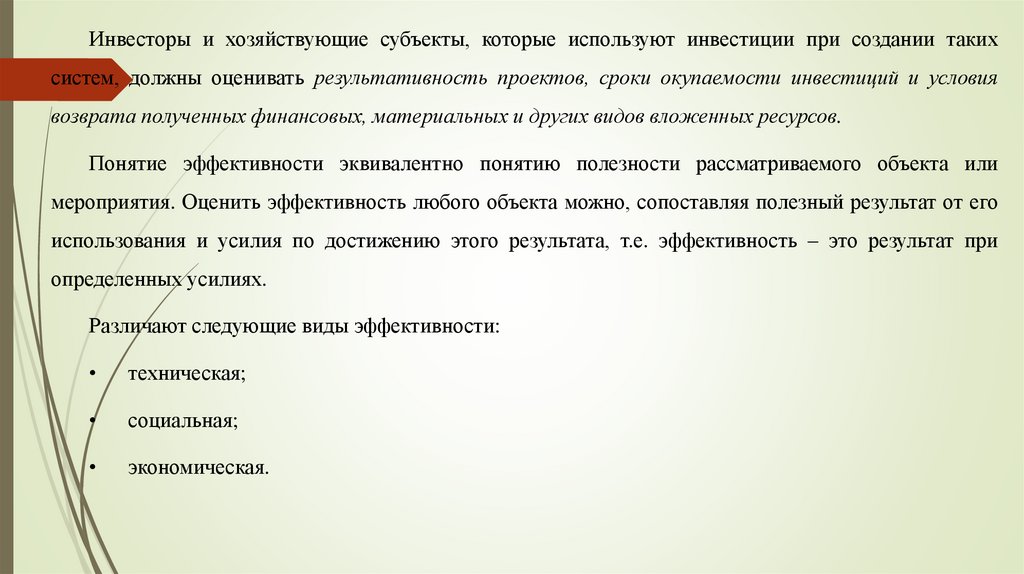 Инвесторы и хозяйствующие субъекты, которые используют инвестиции при создании такихсистем, должны оценивать результативность проектов, сроки окупаемости инвестиций и условия