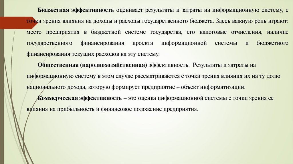Бюджетная эффективность оценивает результаты и затраты на информационную систему, сточки зрения влияния на доходы и расходы государственного бюджета. Здесь важную роль играют: