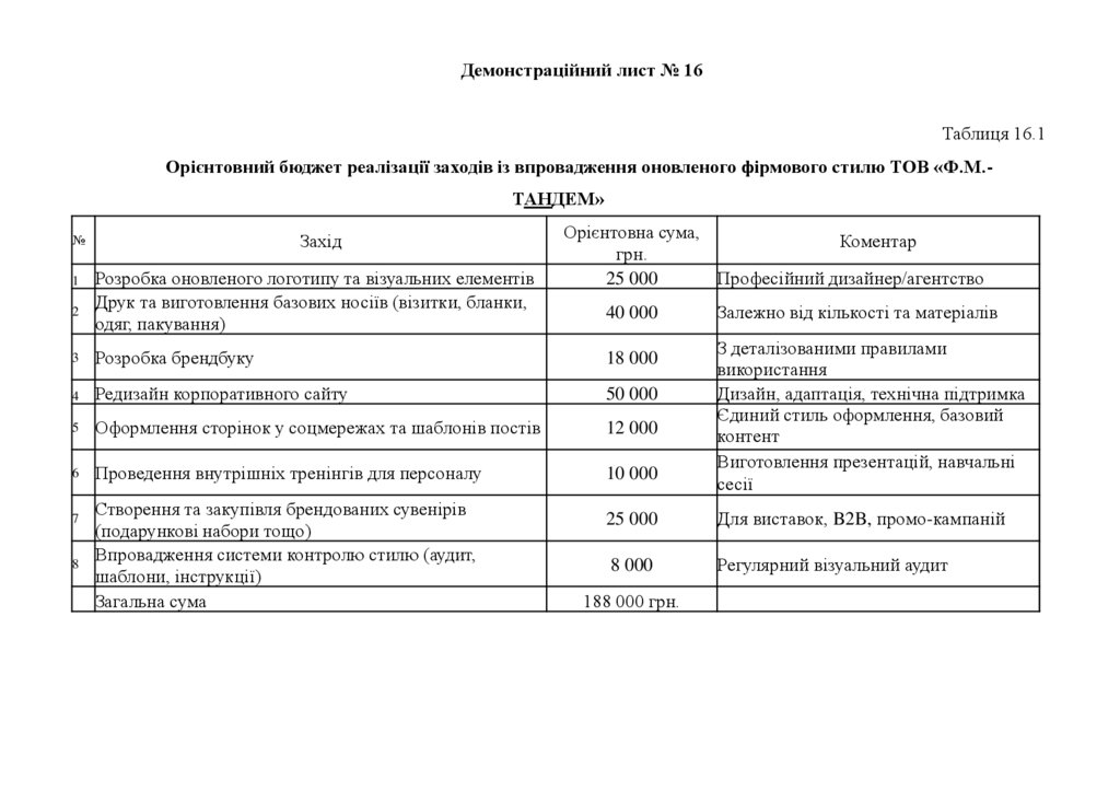Орієнтовний бюджет реалізації заходів із впровадження оновленого фірмового стилю ТОВ «Ф.М.ТАНДЕМ»
