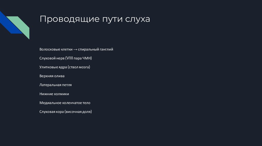 Проводящие пути слухаВолосковые клетки → спиральный ганглий