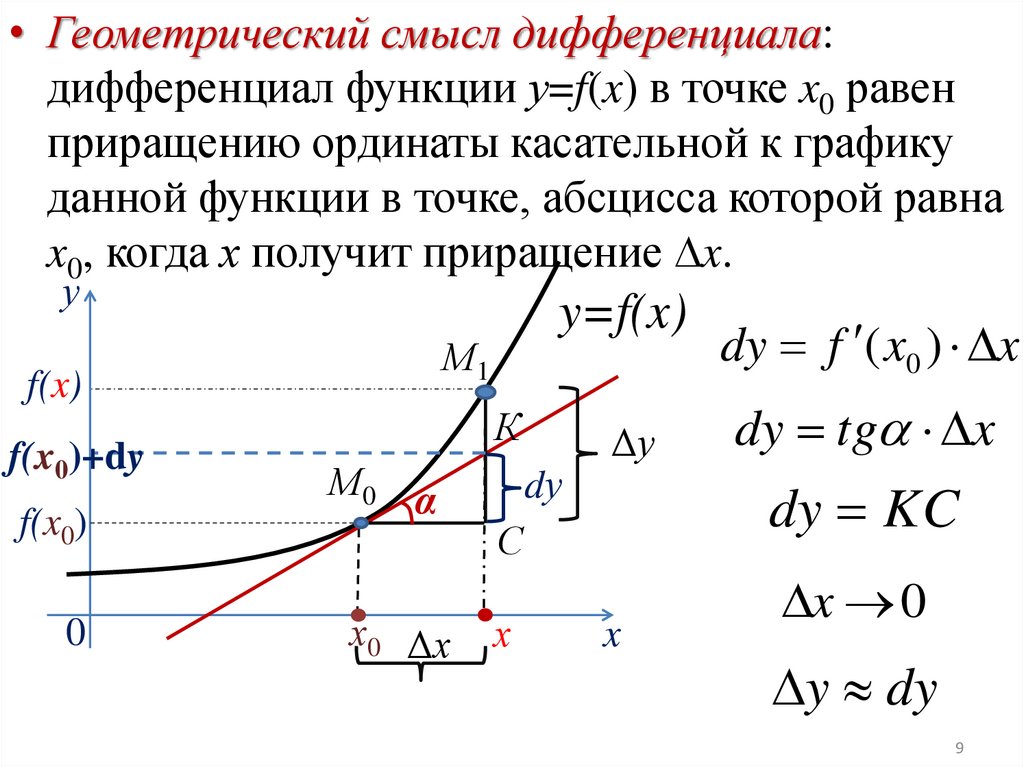 • Геометрический смысл дифференциала:дифференциал функции у=f(x) в точке x0 равен
