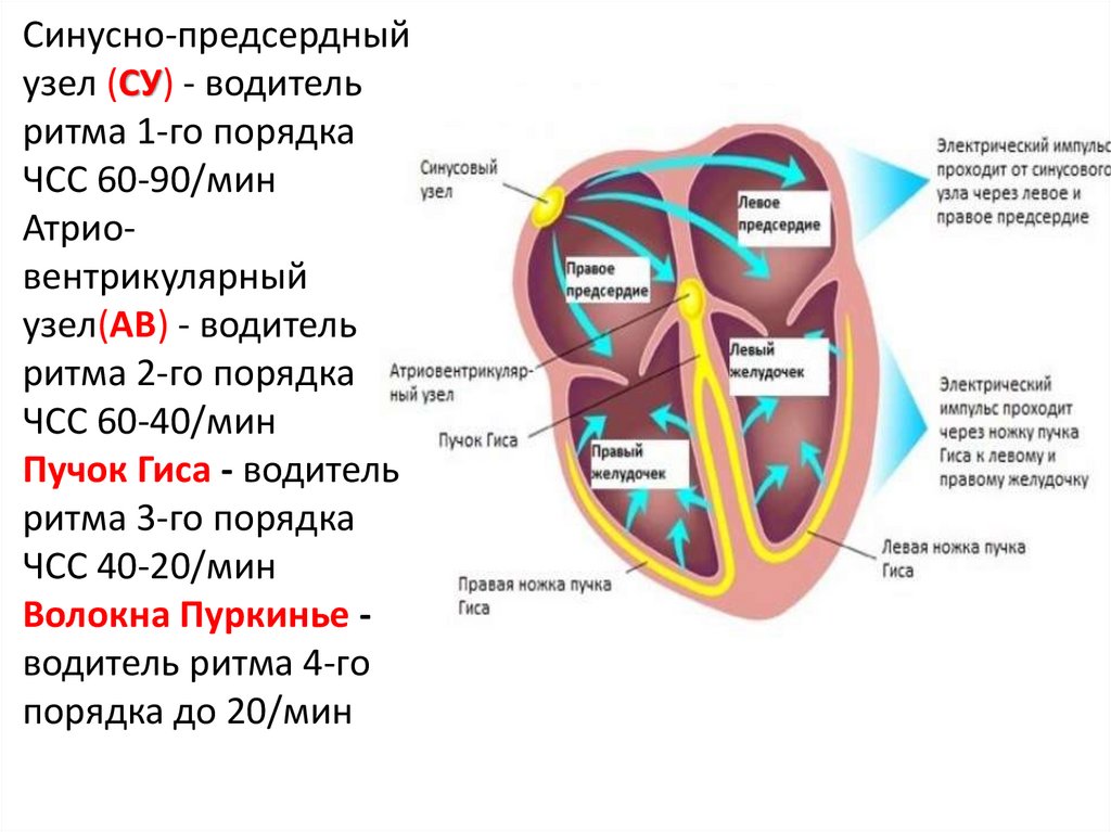 Импульс возбуждения зарождается в пейсмекерных (pace темп, скорость; maker – создатель) клетках синуснопредсердного узла (пейсмекер первого порядка), который внорме задает базовый ритм сердца
