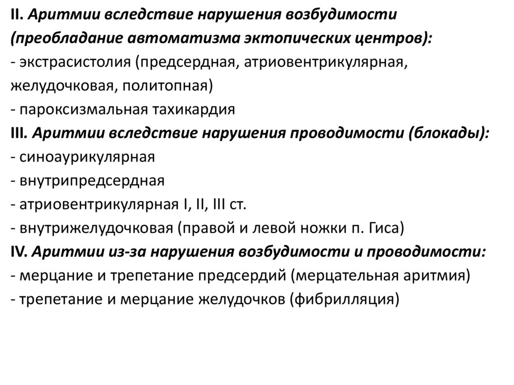 IV. Аритмии из-за нарушения возбудимости и проводимости: