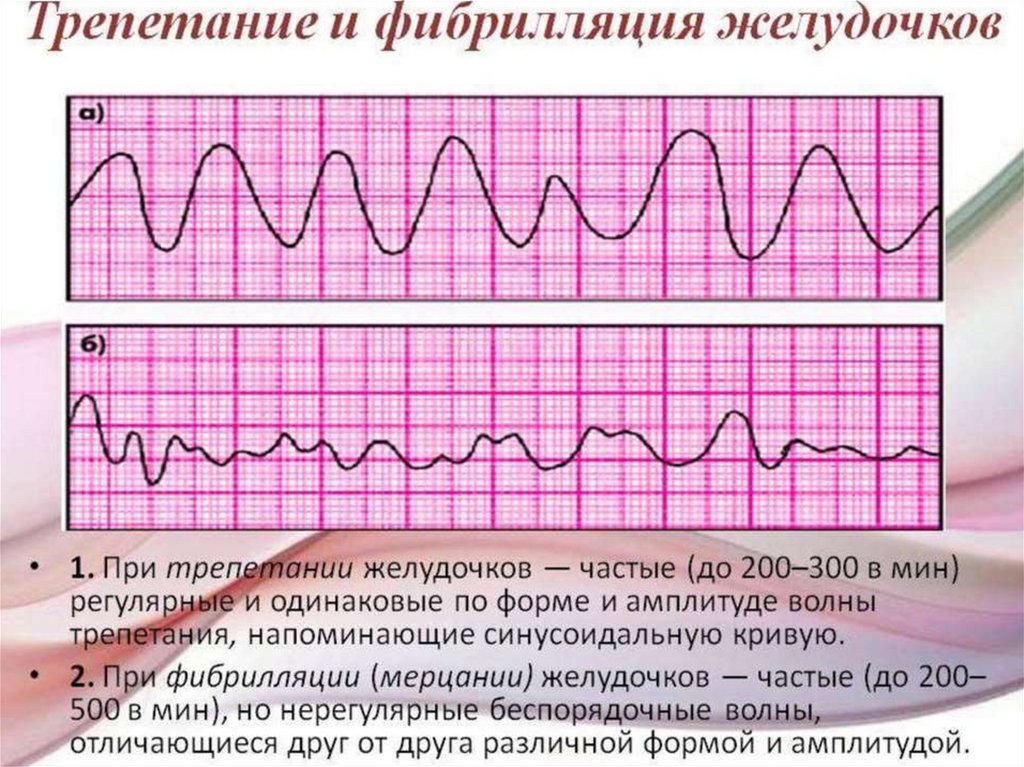 - трепетание и мерцание желудочков (фибрилляция)