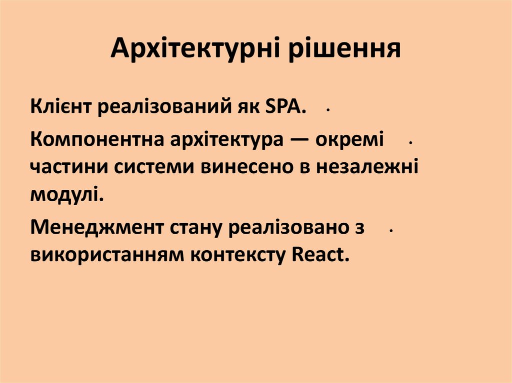 Архітектурні рішенняКлієнт реалізований як SPA. ⦁