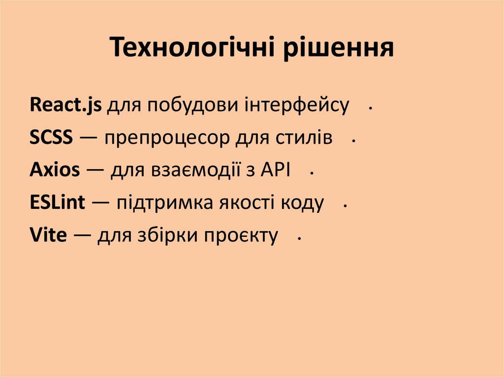 Технологічні рішенняReact.js для побудови інтерфейсу ⦁