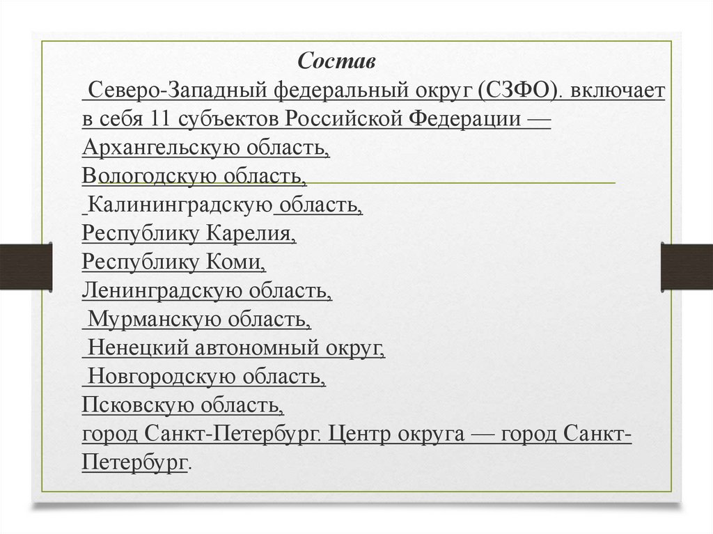 СоставСеверо-Западный федеральный округ (СЗФО). включает