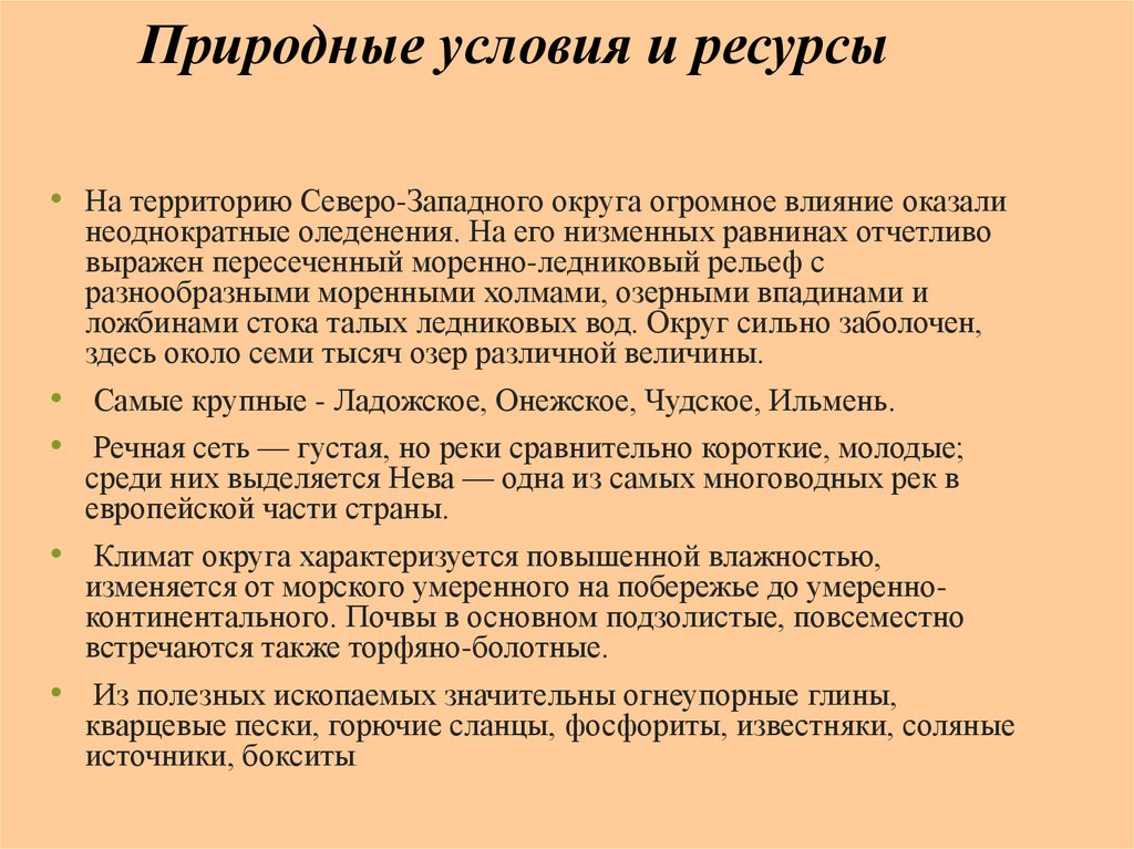 Природные условия и ресурсы• На территорию Северо-Западного округа огромное влияние оказали