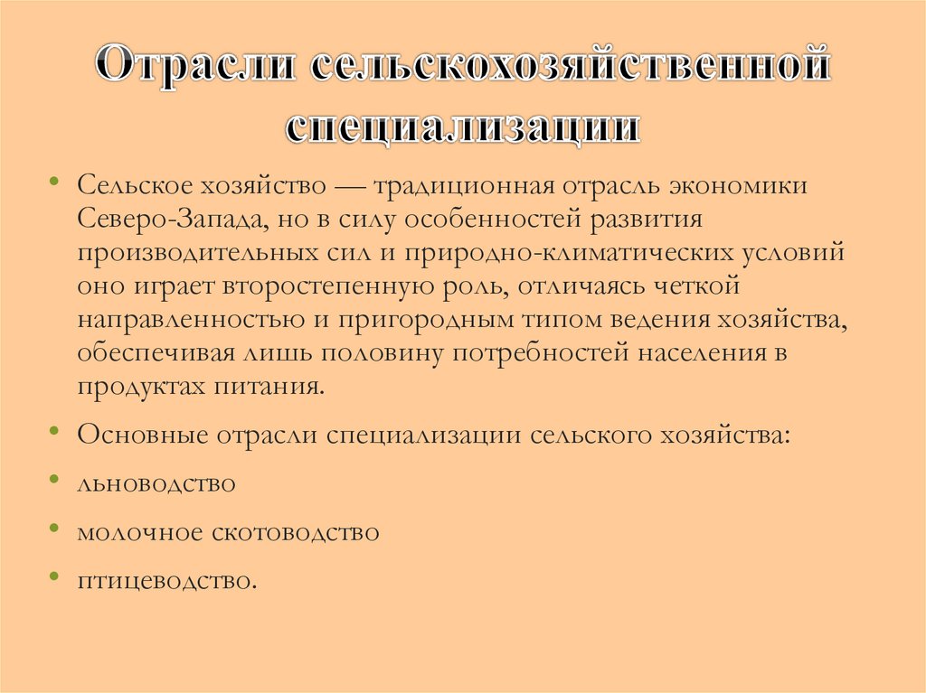 • Сельское хозяйство — традиционная отрасль экономикиСеверо-Запада, но в силу особенностей развития