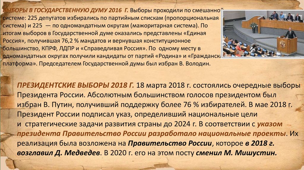 ВЫБОРЫ В ГОСУДАРСТВЕННУЮ ДУМУ 2016 Г. Выборы проходили по смешаннойсистеме: 225 депутатов избирались по партийным спискам (пропорциональная