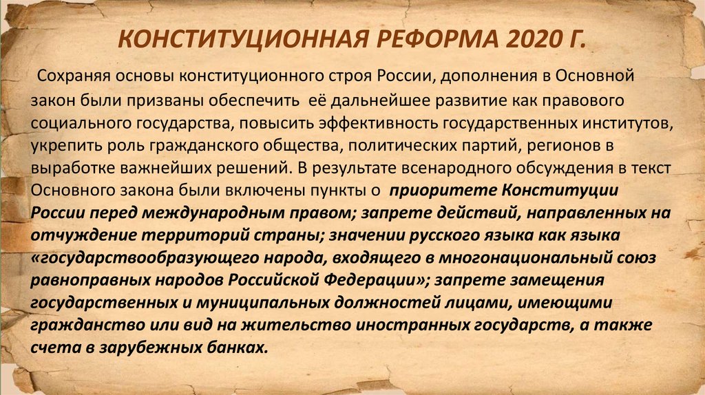 КОНСТИТУЦИОННАЯ РЕФОРМА 2020 Г.Сохраняя основы конституционного строя России, дополнения в Основной