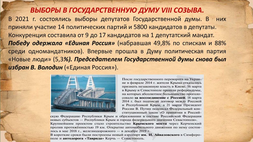 ВЫБОРЫ В ГОСУДАРСТВЕННУЮ ДУМУ VIII СОЗЫВА.В 2021 г. состоялись выборы депутатов Государственной думы. В них