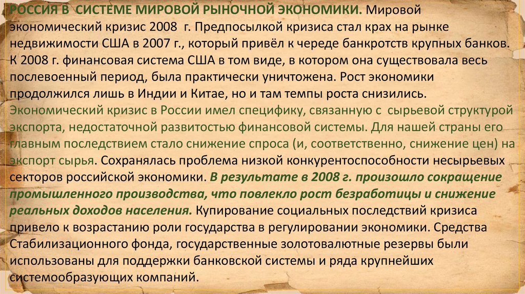 РОССИЯ В СИСТЕМЕ МИРОВОЙ РЫНОЧНОЙ ЭКОНОМИКИ. Мировойэкономический кризис 2008 г. Предпосылкой кризиса стал крах на рынке