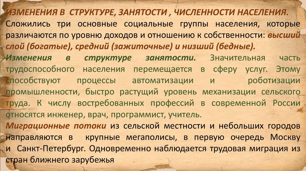 ИЗМЕНЕНИЯ В СТРУКТУРЕ, ЗАНЯТОСТИ , ЧИСЛЕННОСТИ НАСЕЛЕНИЯ.Сложились три основные социальные группы населения, которые