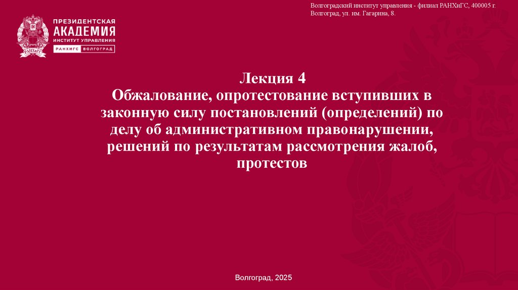 Волгоградский институт управления - филиал РАНХиГС, 400005 г.Волгоград, ул. им. Гагарина, 8.