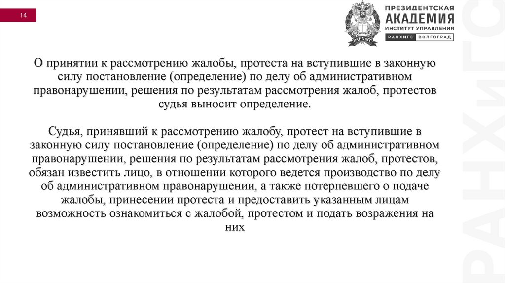 14О принятии к рассмотрению жалобы, протеста на вступившие в законную