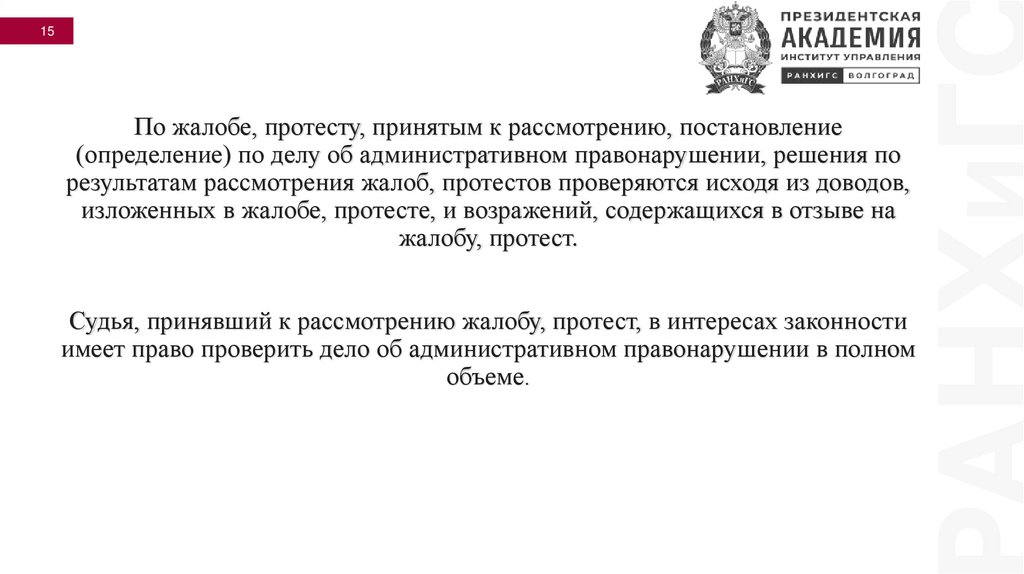 15По жалобе, протесту, принятым к рассмотрению, постановление