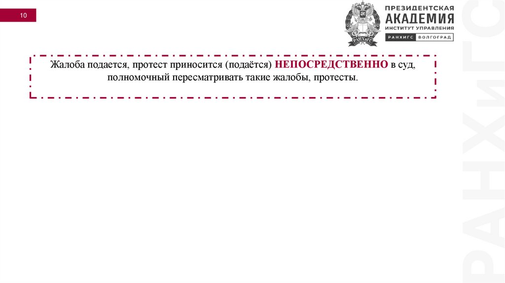 10Жалоба подается, протест приносится (подаётся) НЕПОСРЕДСТВЕННО в суд,
