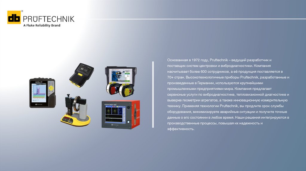 Основанная в 1972 году, Pruftechnik – ведущий разработчик ипоставщик систем центровки и вибродиагностики. Компания