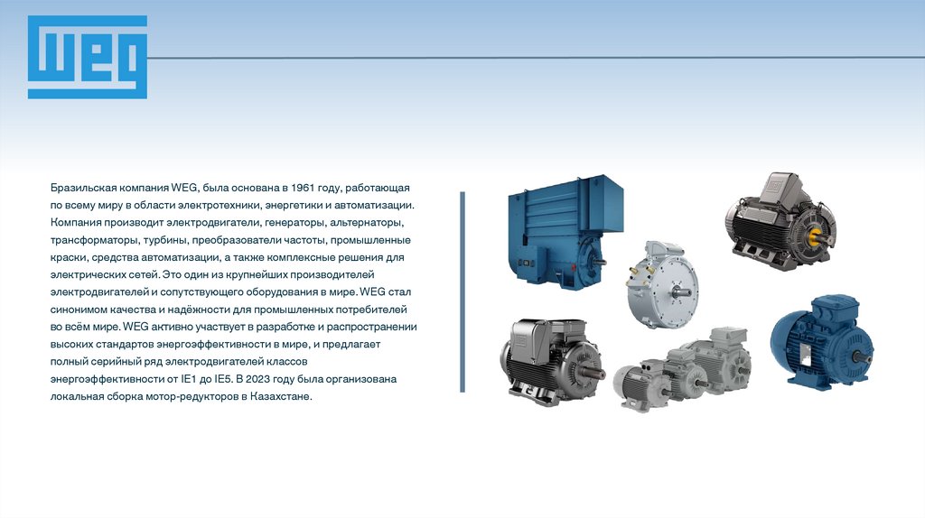 Бразильская компания WEG, была основана в 1961 году, работающаяпо всему миру в области электротехники, энергетики и автоматизации.