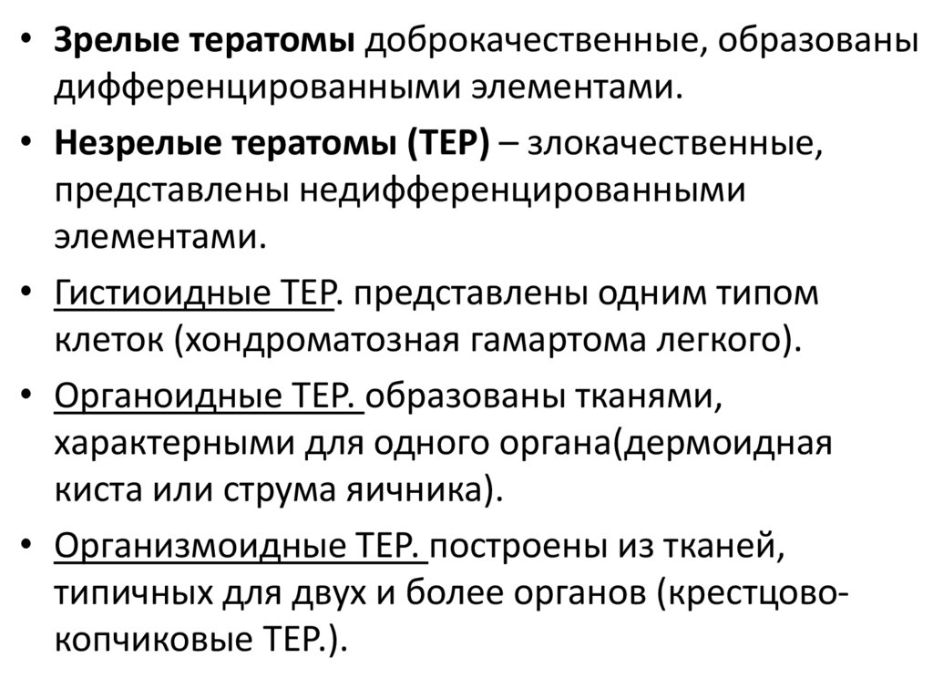 • Злокачественные (незрелые, гетерологичные)опухоли состоят из умеренно- и