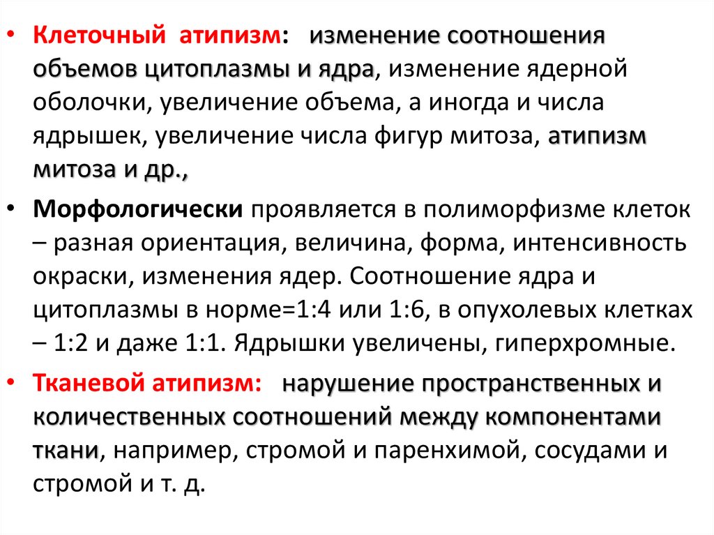 • Клеточный атипизм: изменение соотношенияобъемов цитоплазмы и ядра, изменение ядерной