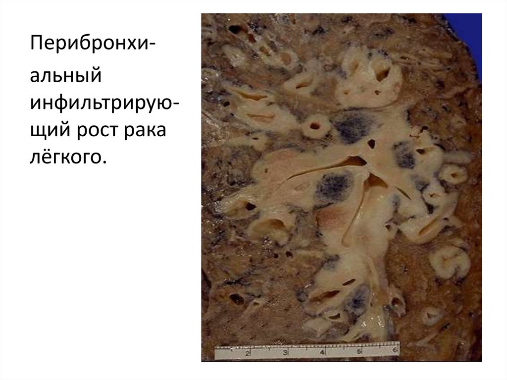 бронха сужен, слизистая шероховатая. На разрезе узел пёстрого вида, с некрозами и кровоизлияниями. Регионарные лимфоузлы корня лёгкого увеличены до 2 см в диаметре, на разрезе –
