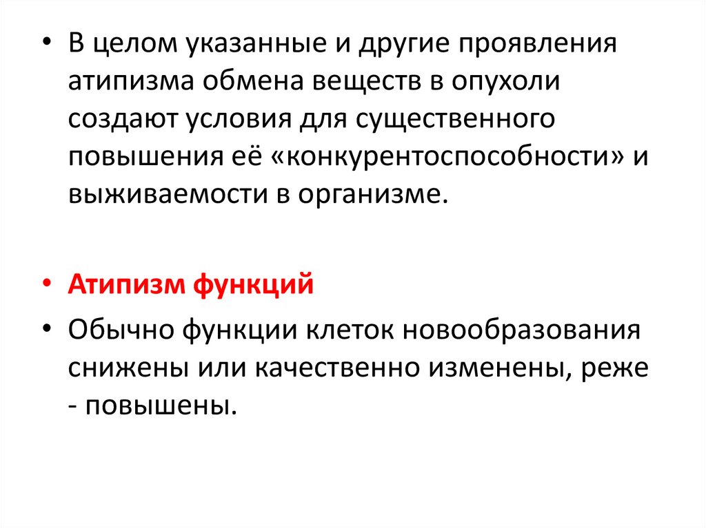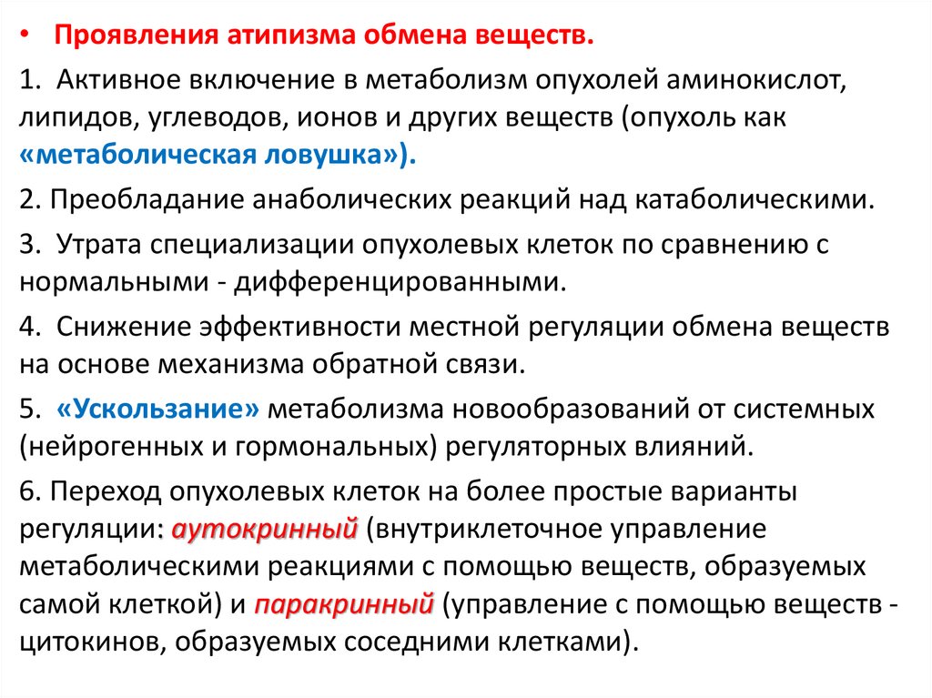 • В целом указанные и другие проявленияатипизма обмена веществ в опухоли