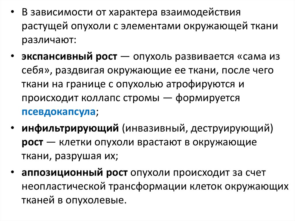 • В зависимости от характера взаимодействиярастущей опухоли с элементами окружающей ткани