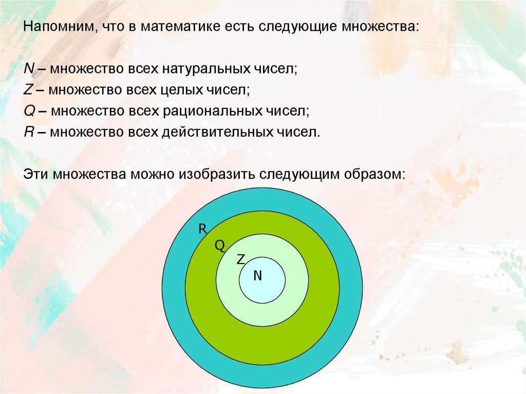 Напомним, что в математике есть следующие множества:N – множество всех натуральных чисел;
