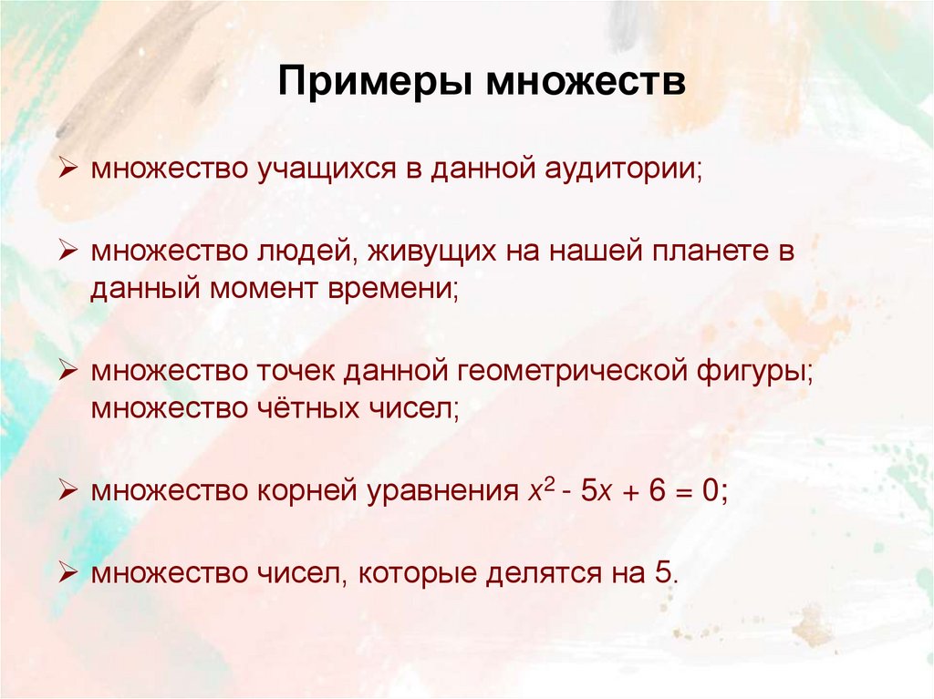 Мы говорим, что число 5 натуральное, т.е. утверждаем, чточисло 5 принадлежит множеству натуральных чисел.