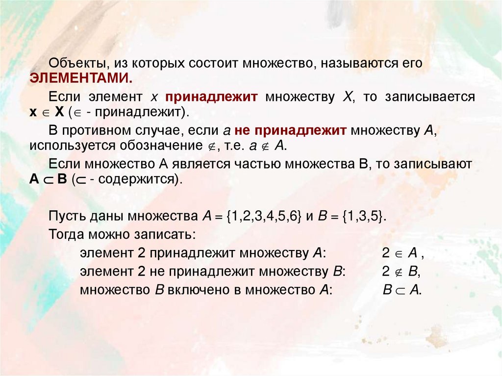 Объекты, из которых состоит множество, называются егоЭЛЕМЕНТАМИ.