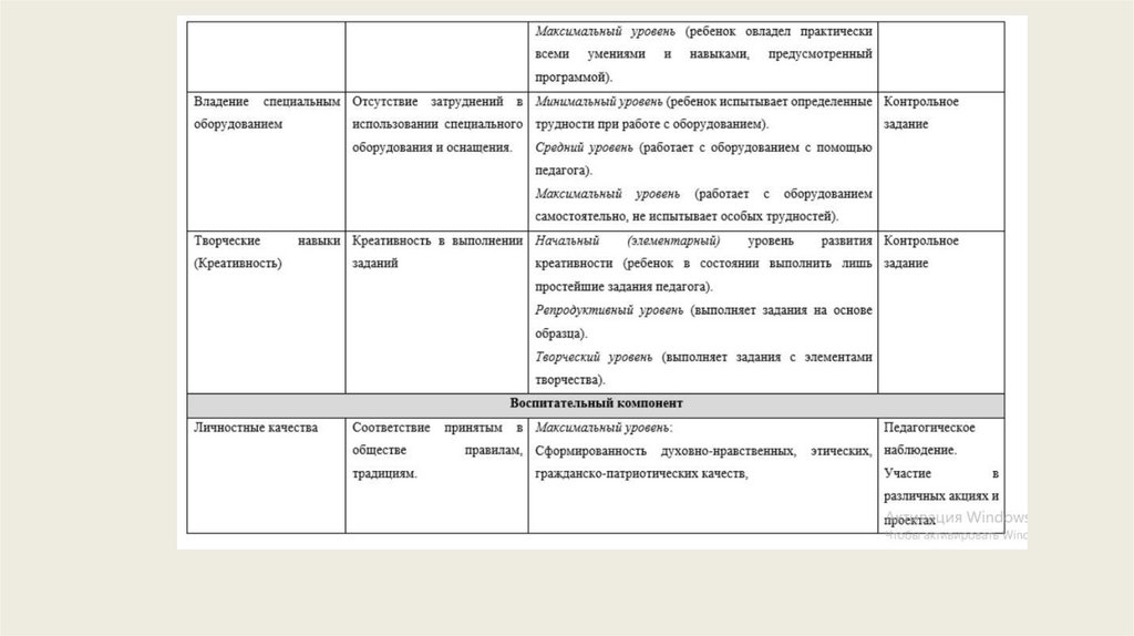 мотивации к выбранному виду деятельности; специальных знаний, умений и навыков; развитие творческих способностей ребенка.