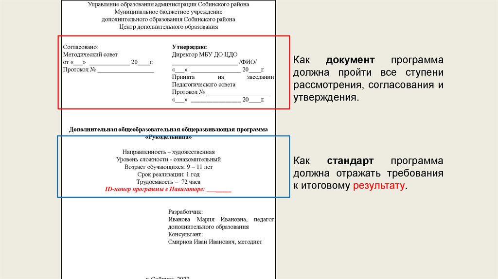 гриф согласования/рассмотрения/принятия программы (слева) в соответствии с порядком,