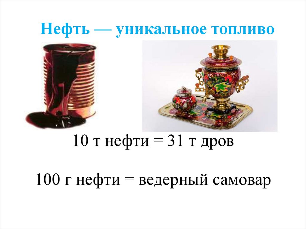 Нефть — уникальное топливо10 т нефти = 31 т дров