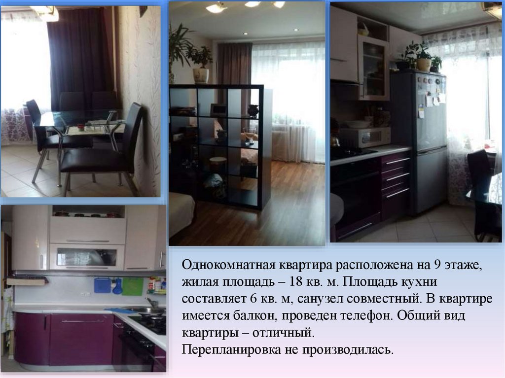 Однокомнатная квартира расположена на 9 этаже,жилая площадь – 18 кв. м. Площадь кухни