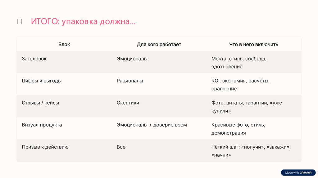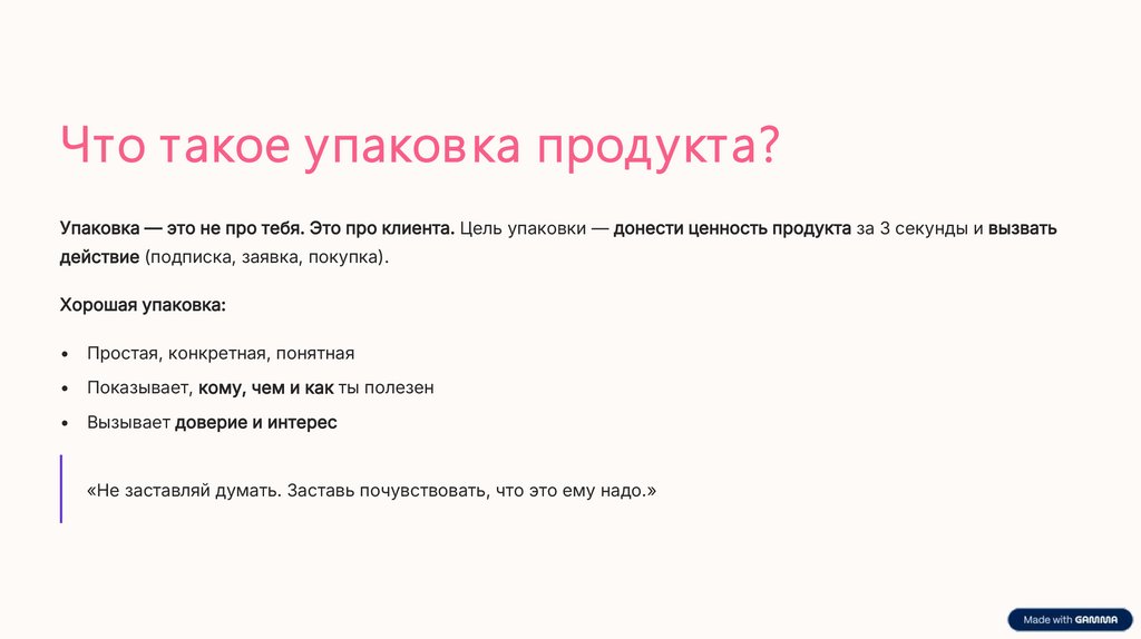 Что такое упаков ка продукта?Упаковка — это не про тебя. Это про клиента. Цель упаковки — донести ценность продукта за 3 секунды и вызвать