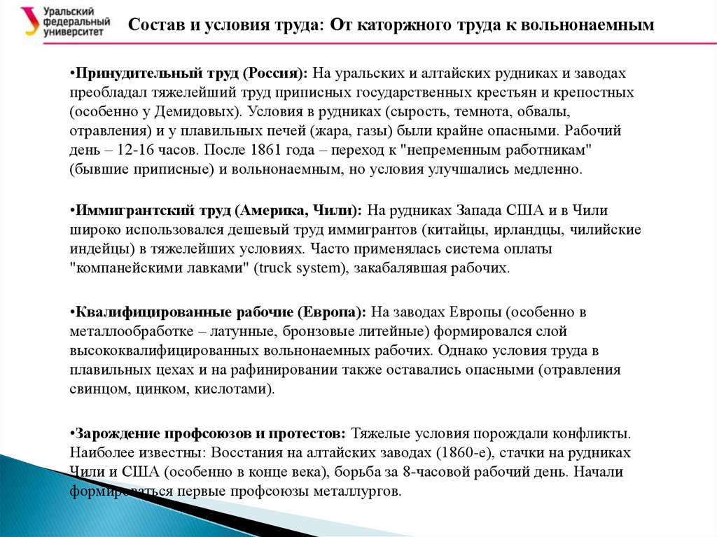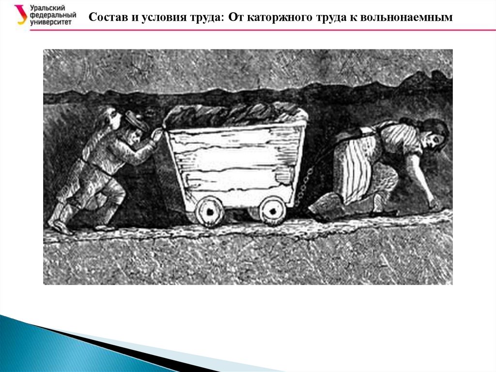 Состав и условия труда: От каторжного труда к вольнонаемным•Принудительный труд (Россия): На уральских и алтайских рудниках и заводах